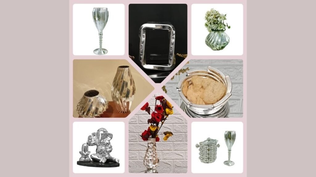 The collection includes: Laxmi Ganesh Set: Placed on agate stone with a lacquered silver coating, Mobius Round Photo Frame: Inspired by the Möbius strip, featuring infinite loops, Pleated VaseCrafted by master artisans, Silver Plated Champagne Flute, Set of 3 Melt Tealights: Tealight holderthat resembles a melting candle, suitable for tealights or taper candles.Made of pure copper, coated with fine silver, and lacquered for stability, Elephant Hammered, Kiss the Sky Photo Frame, Stone Age Bowl, Wings Bowl, Pineapple Bowl, Wine Gobletto name a few.