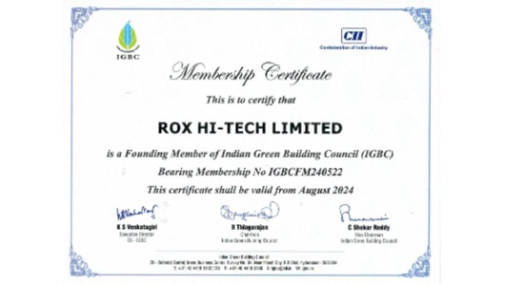 Commenting on this IGBC, Mr. Jim Rakesh Managing Director, ROX Hi Tech Limited said, “As Managing Director of ROX Hi-Tech Limited, I am proud to share that our induction as a Founding Member of the Indian Green Building Council marks a significant milestone in our commitment to sustainable development. This membership not only strengthens our role in promoting green building practices but also aligns with our long-term vision of contributing to a greener and healthier India.