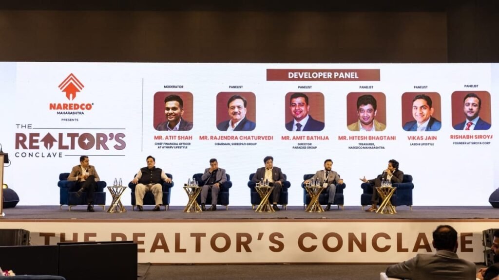 Mr Kamlesh Thakur, Vice President of NAREDCO Maharashtra, Mr Rishabh Siroya, Founder at Siroya Group, Mr Vikas Jain, President, NAREDCO Maharashtra NextGen and CEO of Labdhi Lifestyle, Mr Hitesh Bhagtani, Treasurer of NAREDCO Maharashtra, Mr Amit Bathija, Director of Paradise Group, Mr Rajendra Chaturvedi, Chairman of Shreepati Group, and Mr Atit Shah, CFO at Atharv Lifestyle were key participants in the Developers’ Panel at The Realtor’s Conclave.