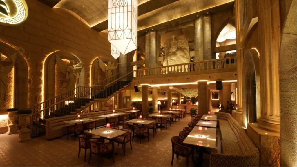 Lighting plays a critical role in balancing the grandeur of the space. Warm amber lighting is discreetly placed behind arches, sculptures, and textured surfaces, allowing stone finishes and carved details to glow softly. During the day, natural light filters through semi-open areas and balconies, creating an airy and welcoming atmosphere. As evening sets in, the lighting transitions seamlessly, lending the space a more intimate yet energetic character.